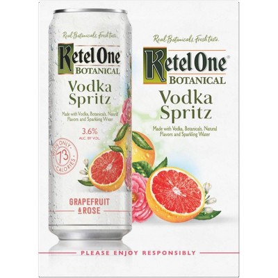 Includes one 72 proof 12 fl oz can of Ketel One. Includes four 45 alcvol. Includes one 72 proof 12 fl oz can of ketel one botanical vodka spritz grapefruit rose.